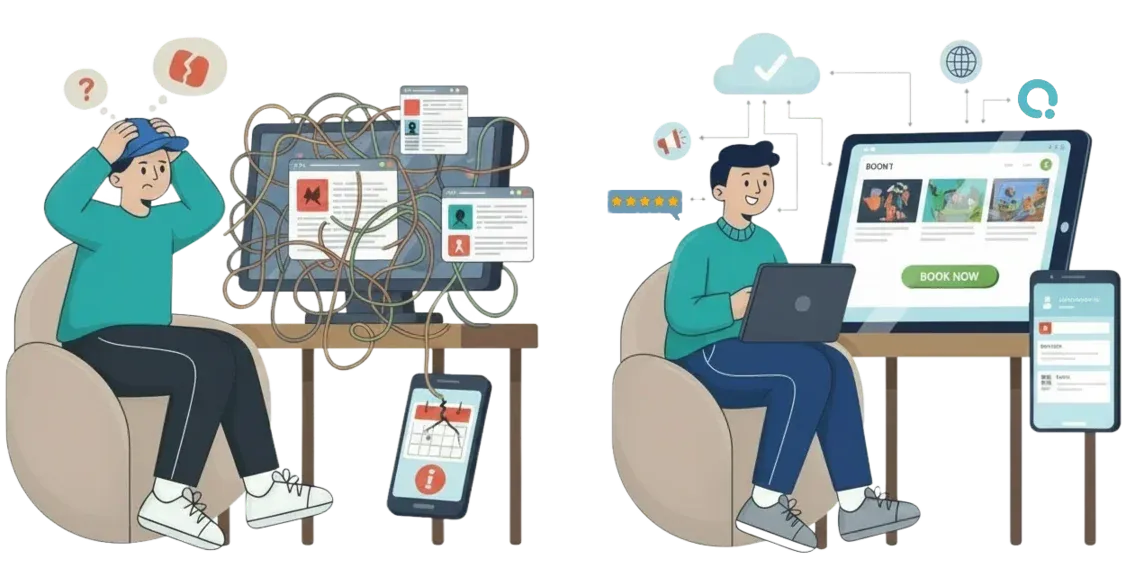 You handle bookings by phone, email and manually in the calendar instead of focusing on players and the in-game experience. Every date change, player count or query takes a few minutes – and that can easily add up to an extra hour a day.